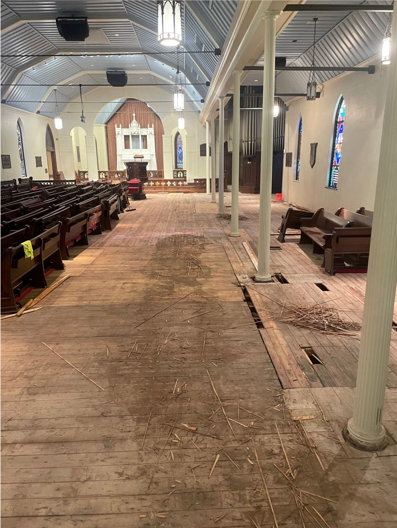 Church furnishings including the old organ console have been removed, and scaffolding has gone up all around the Historic Church. The triptych paintings above the altar have been put in safekeeping pending their restoration. SpawGlass, our contractor, will number all the pews before removing them so they go back to their proper places at the end of construction. The memorial wall plaques will be removed, and other critical components will be protected in place. The windows will be completely covered for protection until some are restored. In Grace Chapel and its vestibules, the furnishings have been taken out, and the worn red carpet is gone. The first day of demolition revealed historic tile under the old carpet at the south double doors!