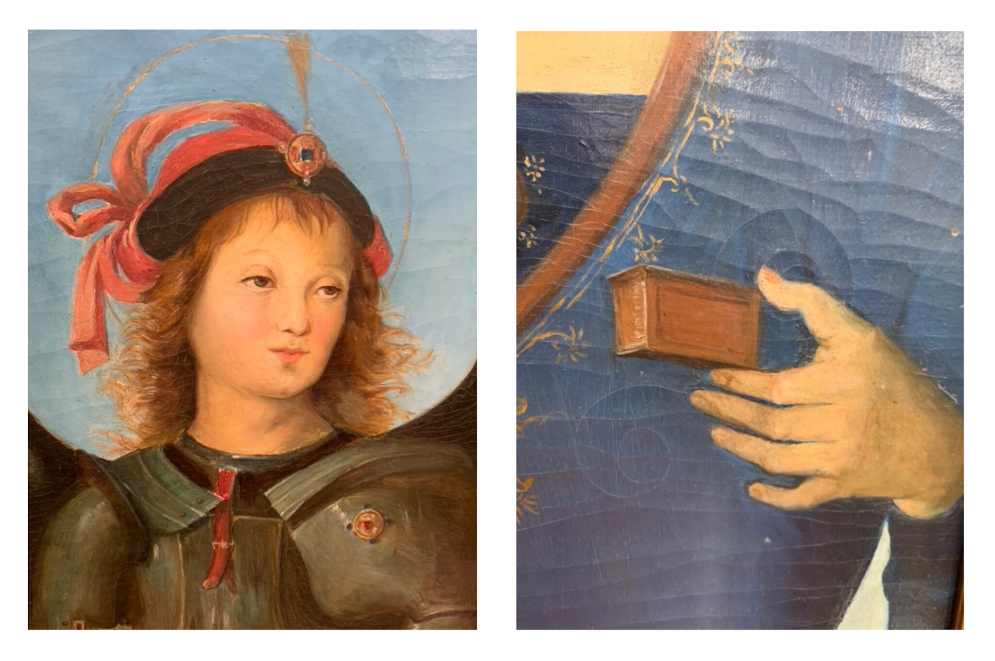The paintings had a number of problems which the conservator will try to repair: patterns of cracks and “cupping” in the paint surfaces (apparent in the photo details of the head of St. Michael and the hand of the Angel Raphael), mismatched previous retouching, overly-harsh cleaning attempts, and adhered candle wax. The current lighting on the paintings makes the cracks more noticeable, especially when viewed from below while kneeling at the altar rail.