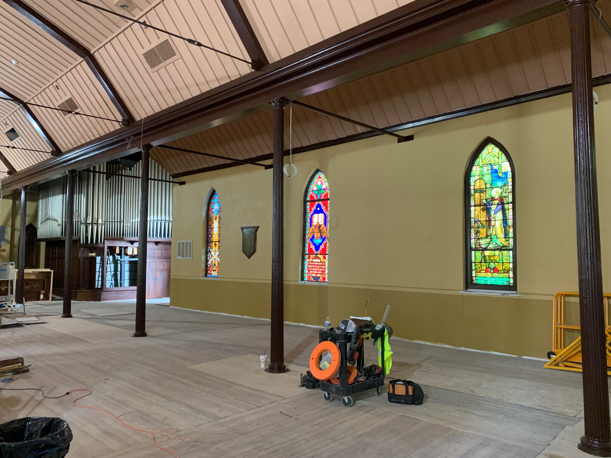 In the photo titled “Paint Progress,” light again fills the Historic Church as the stained-glass windows are partially uncovered or re-installed. Exterior and interior painting is mostly complete, with the new rose-colored ceiling paint, painted and glazed walls with wainscot, east aisle columns, and trim all reproducing St. David’s historic colors from the late 1880’s. The faux pink granite chancel columns, decorative architrave paint above the restored gothic chancel arches, and chancel walls are in progress. Next: installation of the new oak hardwood finished floor.