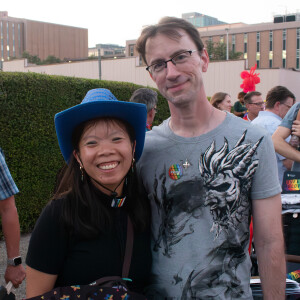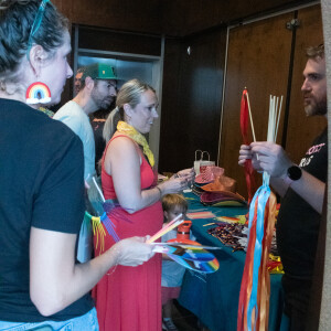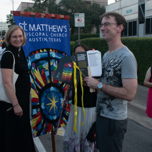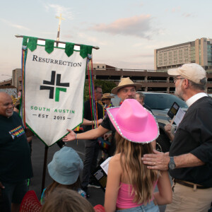After worship, there was a brief gathering in the Historic Church foyer for everyone to grab their PRIDE swag and get water bottles. At the same time, Fr. Chad McCall, who organized the evening, offered directions to the parade route. Then we walked as a community to San Jacinto, where Father Chuck was waiting to pull the parade float in his truck next to banners for St. Matthew's Episcopal Church, Resurrection South Austin, thurifers from Seminary of the Southwest, and more affirming Austin-area communities.