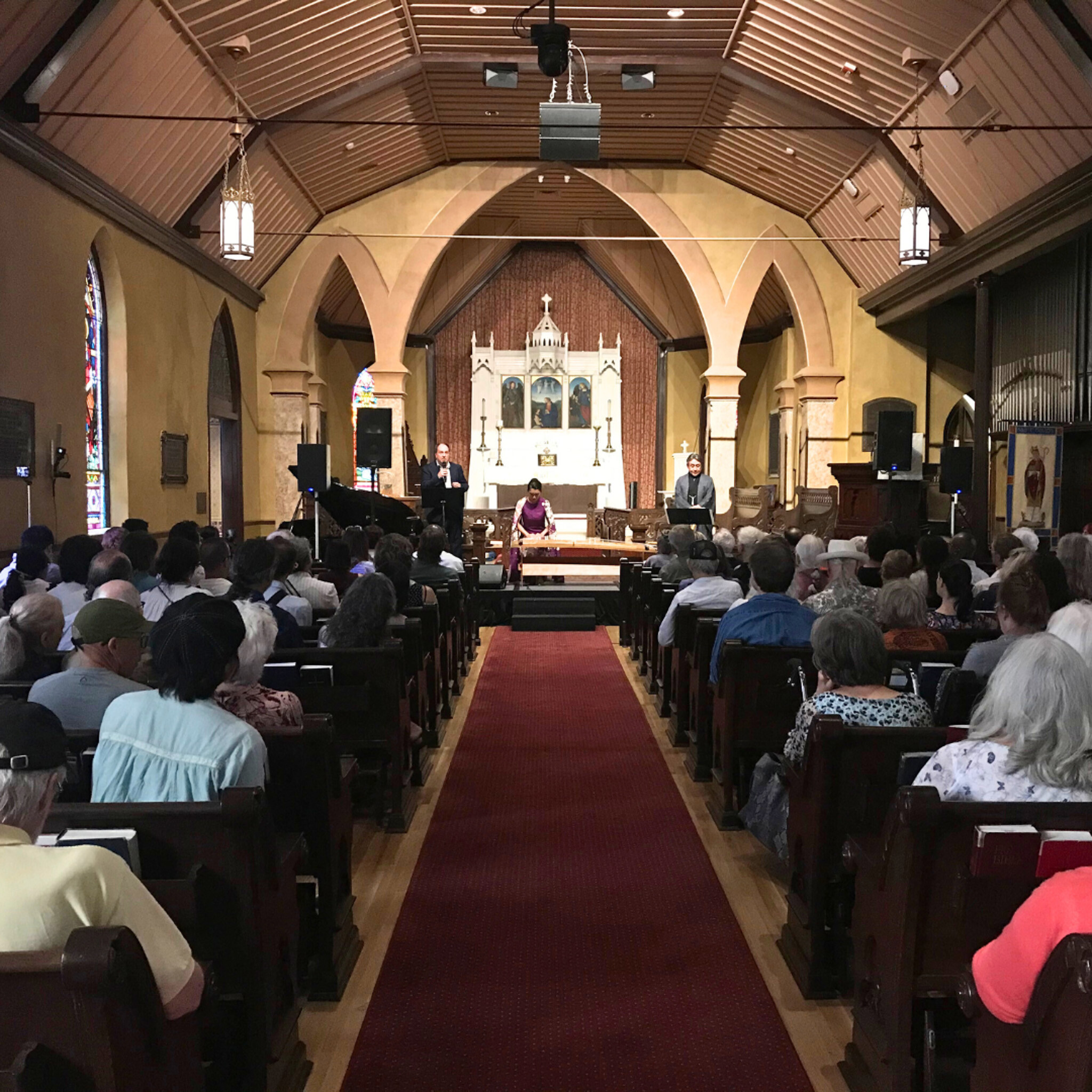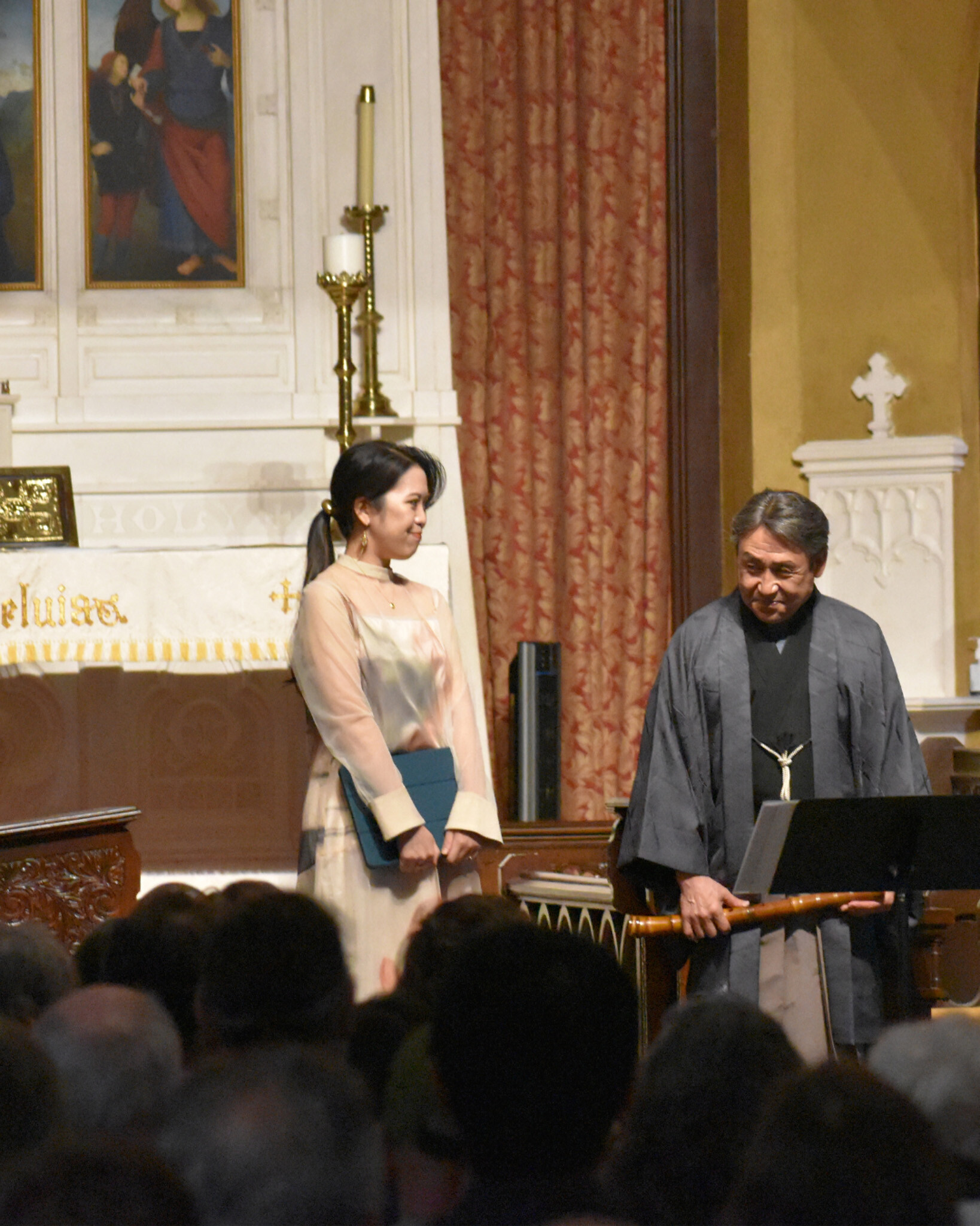 The second season of our World Music Encounters series concluded last night with a sold-out show featuring master shakuhachi (Japanese bamboo flute) player Zenyōji Keisuke on his first-ever trip to the United States. The second set featured Kaneko Sumie, an innovative New York-based vocalist and composer on the koto (13-string zither) and shamisen (3-stringed plucked lute). Sumie was accompanied by Austin-based jazz heavyweights, pianist Rique Pantoja and bassist John Fremgen. Japanese music scholar Dr. Marty Regan, producer of the World Shakuhachi Festival in College Station (where he is a professor at Texas A&M University), co-hosted the concert and provided translation. After the last song and a rousing ovation from the crowd, series creator John Burnett asked concertgoers to fill out the survey found in the program, including ideas for season three!