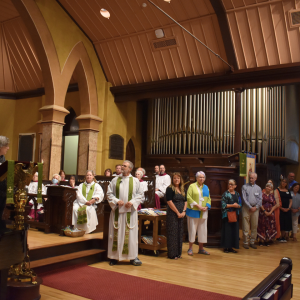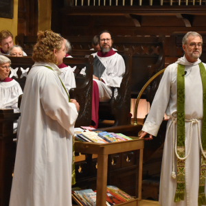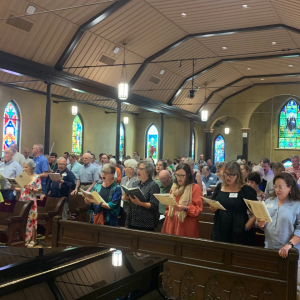 Historic Church was full at the 10:30 a.m. all-parish worship, captured in a selfie for Pastor Angela by Father Chuck! The parish blessed books from our July back-to-school book drive for Norman-Sims Elementary collected in collaboration with Welcome Table at St. James Episcopal Church.