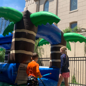 On the playground families found bubbles, a hotdog/fruit/cookies lunch, and giant inflatable splash pad! Kid's were able to wear swim gear to church, get a break from the heat and celebrate the last days of summer!